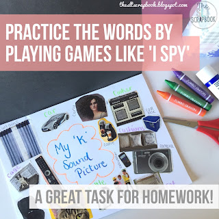 easy speech therapy homework too! I set them a task of making their own speech sound collage; they have to look through another catalogue or magazine at home and come up with a list of items and make a new collage to share in our therapy session the following week!
