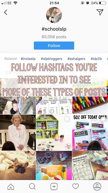 Basically, hashtags are ways for people to “tag” their posts so other people can find them. You can use hashtags in your posts so they’re found by others, and you can click the hashtags to find more related pictures. Popular SLP hashtags include #SLPeeps, #speechtherapy, and #instaslp. You can use any hashtag you like though. If you’ve posted a picture about a sensory bin, you can either click the hashtag in your post or you can type #sensorybins into the search bar on the ‘Explore’ page (the one with the little magnifying glass) and find all the other pictures that show sensory bins. If you’re really interested in a particular topic, you can also follow hashtags and view any stories that people have tagged too!
